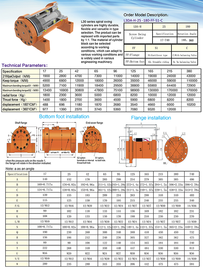 L30系列螺旋擺動油缸具有高度的經久耐用,選型靈活通用,本產品與進口件可以1:1復換使用,并根據工況可以選擇缸體材質,適應各種工況條件。